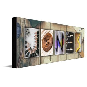 Makes a great personalized gift for people who love arts & crafts! Images include pencils, scissors, buttons, yarn, paint brushes, colored pencils and more set on top of a fun wood background. Order yours today!