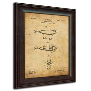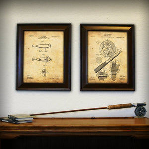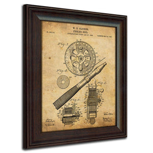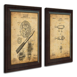 This set of 2 framed prints features the patents for an antique Heddon fishing lure and Glocken reel. Based on the actual drawings of patents filed in the US, these rustic prints are set against an aged parchment background! These prints are a perfect fit for any décor. Each of the prints is finished behind glass in a 14”x17” contoured wood grain frame and is ready to hang on the wall!