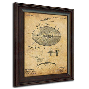 Based on the actual and original USA patent drawings (early 1900,s) of a football and football helmet. Artistically set on a vintage paper background, each print is published in our USA studio and finished behind glass in a 14"x17" contoured frame with a brown wood grain