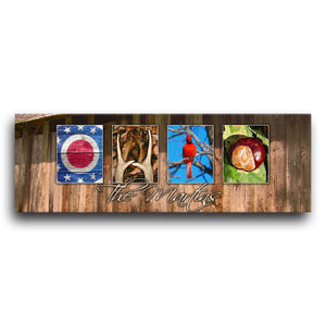 This colorful Ohio wall art print features themed photography from the Buckeye State to spell Ohio. Add your family’s name or word of choice to the personalized art print below the photos. Simply enter your desired personalization in the input box below and let our artists do the rest.