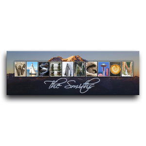 Below the photos that spell "Washington" add your family’s name or text of choice. Simply enter your desired personalization in the input box below and let our artists do the rest.
