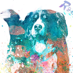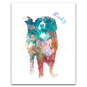 Celebrate your Bernese Mountain Dog with this colorful personalized print that includes your pet,s name customized as a part of the image. Created in a colorful watercolor style, this Bernese Mountain dog art print makes a special gift or pet memorial.