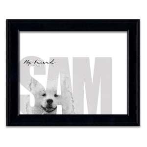 Celebrate your pet Samoyed with this contemporary personalized art print that includes your pet,s name customized as a part of the image. Simply enter your pet,s name in the input box below and our artists will create a beautiful image with the Sammy peeking through the font. It makes a perfect unique gift for dog lovers, Samoyed owners & Samoyed breeders.