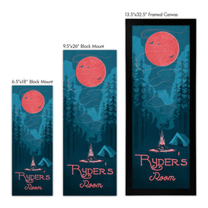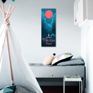 Bring a whimsical personalized touch to your child,s room with our personalized camping art showcasing a tent, campfire, mountains, and sprawling pine trees. It features your customized text on two lines at the bottom of the print.