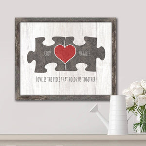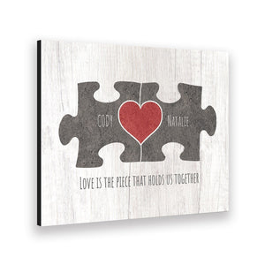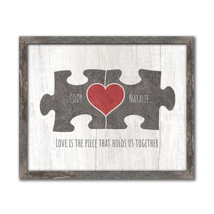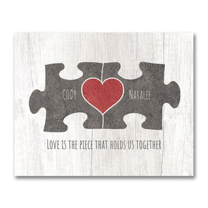 This special personalized gift features two names etched into the puzzle pieces connected by a heart shaped piece. The quote below reads, "Love is the Piece That Holds Us Together".