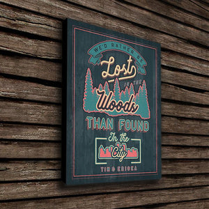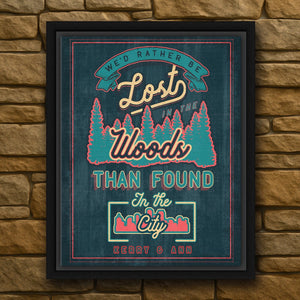 This fun sign features your personalized names as a part of the art, below the quote: "We,d rather be lost in the woods than found in the city".
