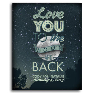 The night sky is the beautiful backdrop in our "Love you to the moon and back" romantic quote wall art.