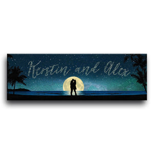 When your love is bigger than the night sky, your names are written in the stars. This romantic gift features a beautiful night sky, the silhouette of two lovers kissing in the moonlight beach and your names in the art.