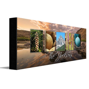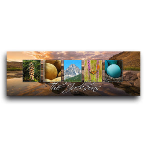 This creative and colorful Idaho wall art print features themed photography from the beautiful Gem State which spells out "Idaho." Below the photos, the print includes a space to add your family name or word of choice to this personalized art design. Simply enter your desired personalization in the input box below and let our artists do the rest. This state art piece shows how colorful Idaho can be with greens, blues, and pinks.