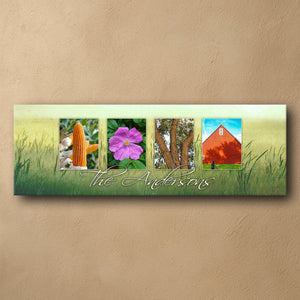 This creative and calming Iowa wall art print features themed photography from the Hawkeye State to spell the word Iowa. Add your family’s name or word of choice below the images to the personalized art piece. Simply enter your desired personalization in the input box below and let our artists do the rest. The field of green grass in the background gives the state art print a colorful touch when combined with the bright colors of a red barn, a purple flower, and yellow corn.