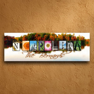 This creative and stunning North Carolina gift features themed photography from the state to spell its name! The background displays an autumn lake and below the photos, the personalized print has a space to add your family’s name as a part of the artwork! Simply enter your desired personalization in the input box below and let our artists do the rest.