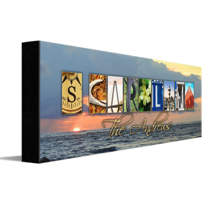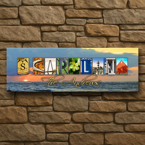 This creative and stunning South Carolina state art print features themed photography from the state to spell its name! Below the photos, the personalized print has a space to add your family’s name! Simply enter your desired personalization in the input box below and let our artists do the rest.