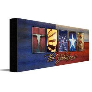 This creative Texas wall art print features themed photography from the state to spell its name. Below the photos, the print has a space to add your family name or word of your choice in the personalized art print! Simply enter your desired personalization in the input box below and let our artists do the rest.