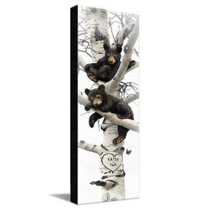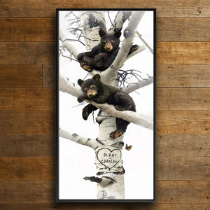 This fun print features two black bear cubs and your custom personalization. Select your print display/size, next select if you would like a personalized sign or carved heart on the Aspen tree. Then, simply enter your personalization in the input box below and let our artists do the rest! Our artists will create your personalization as a part of the artwork.