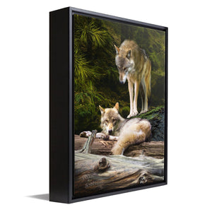This stunning personal print by wildlife artist Scott Kennedy features two beautiful gray wolves and your name(s) personalized as part of the print. Your names will be made as a part of the artwork, ,carved, into the log in the lower left corner of the image.