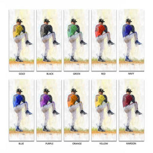 Personalized sports gifts for the baseball pitcher that features your name on the jersey as well as selection of skin tone, right or left handed player, the jersey number, and jersey color of your choice. Simply enter your customization options in the input boxes and let our artists do the rest... ships ready to hang and enjoy!