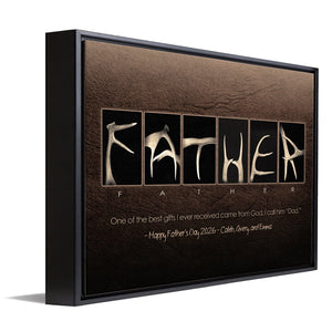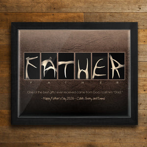 This heartfelt print spells "father" in a rustic antler letter theme and includes the quote: "One of the best gifts I ever received came from God. I call him ,Dad.,"