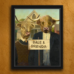 This fun adaptation of the classic 20th-century painting, American Gothic, features two highland cows and your personalization on the sign. It makes a great customized gift for any special occasion and fun farmhouse décor for your country home.