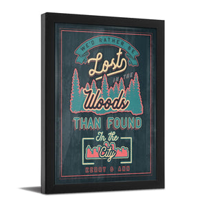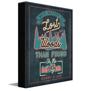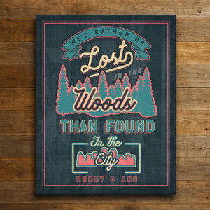 This fun sign features your personalized names as a part of the art, below the quote: "We,d rather be lost in the woods than found in the city".