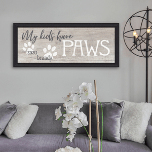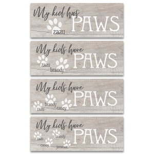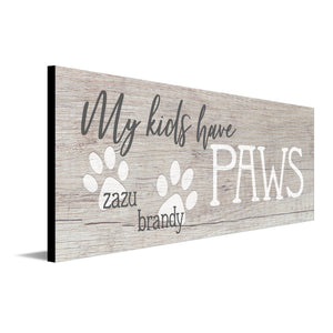 This personalized gift for pet parents is personalized with the number of paw prints, the name(s) of your loved pets, along with the quote, "My Kids Have Paws."