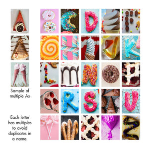 • Includes a full alphabet of sweet-themed images, such as candy, sprinkles, baked goods, ice cream, macaroons, doughnuts, cookies, ice cream, and other desserts.