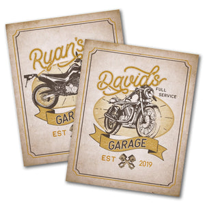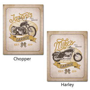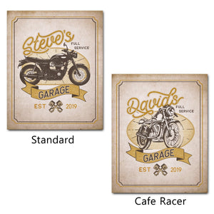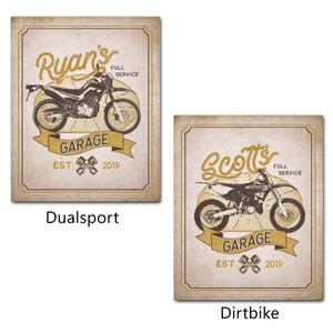 Our vintage motorcycle garage sign print is customized for you with your name and date as a part of the art! Available in six motorcycle options: Chopper, Harley, Dual sport, Dirt bike, Standard and Café Racer.