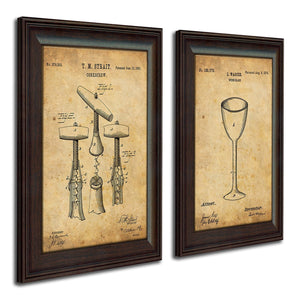 The set of two framed wine art prints are made from the original US patent drawings of a wine glass (1876) and corkscrew (1883). Each is set against an aged parchment background to create a beautiful accent to any décor.
